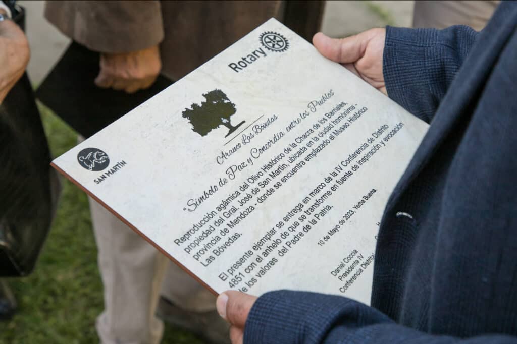En este sentido, en las instalaciones de la Municipalidad de Yerba Buena se plantó un ejemplar de olivo hijo del árbol original perteneciente a la chacra del General San Martín en Mendoza. ‘’Para nosotros esta visita es muy especial porque se ha hecho una reproducción agámica de esa especie y se entregó este ejemplar como un símbolo de unión de fraternidad y concordia entre los pueblos del país’’, expresó Hugo Córdoba, Gobernador de Rotary Distrito 4851.